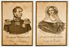 On 29 November 1823, she married the future King Frederick William IV of Prussia[3] and supported his intellectual interests, namely his attempts at artwork, which he held dear to his heart. She refused to become a Protestant as a condition of her marriage, insisting that she would only convert if she was convinced on the merits of the reformed faith after studying it for herself.[4] It was only 5 May 1830, seven years after her marriage, that Elisabeth formally converted to Protestantism.[5]