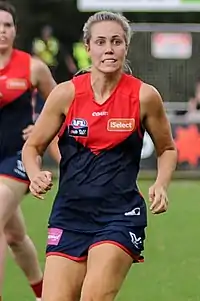 Hogan was elevated to Melbourne's main squad in March 2017 as an injury replacement for Pepa Randall, Meg Downie and Stephanie De Bortoli.[5] A week after her elevation, she made her debut in the two point win against Adelaide at TIO Stadium in round six.[6] She managed just two kicks in the match[7] and was subsequently omitted for the final round match against Fremantle at Casey Fields.[8] She was not retained on Melbourne's list at the end of the season and was consequently delisted in May 2017.[9] After the conclusion of the 2017 AFL Women's season and due to the discontinuation of the VWFL after the 2016 season, she joined Geelong in the Victorian Football League Women's (VFL Women's) for the 2017 season.[10]