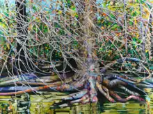Bradford's work, most often large landscapes painted with bright colors, displays "a startling and unusual sense of color" according to art critic and curator Carla Hanzal. She draws her inspiration from the "really big cathedral" of outdoor life,[1] often venturing into the woods and the National parks, hiking or kayaking, to find subjects for her paintings.[2] She calls her work "existential landscapes" and states bluntly the reason behind her paintings: "It's about human life and what it's like to live in the world."[5] Trees and tree roots, rocks and rivers, feature prominently in her paintings.[6] Her canvases capture landscapes spanning from the North Carolina hills to the Everglades, Cumberland Island in Georgia, and even to international locations such as Greece and France, where she has spent time in artist residences.[3] Lee Carol Giduz, executive director of the Blowing Rock Art and History Museum emphasizes the powerful evocation of nature in Bradford's work: "Her bold strokes and vibrant palette make trees grow and water flow."[3]