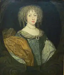 The most important caregiver in Liselotte's life was her aunt Sophia of the Palatinate, her father's youngest sister, who also lived in Heidelberg Castle with Charles I Louis until her marriage in 1658 with Ernest Augustus, Duke of Brunswick-Lüneburg.[12][13] In order to deprive Charlotte of her daughter,[14] in 1659 Liselotte was sent by her father to her aunt's court in Hanover; she later remembered this time as the happiest of her life.[15] Sophia became in a motherly figure for her niece, and remained her most important confidante and correspondent throughout her life.[16] During this time she also took a total of three trips to The Hague, where Liselotte could meet her paternal grandmother Elizabeth Stuart, the "Winter Queen" of Bohemia, who was still living in exile.[17][18] Although in general she didn't particularly love children, she became very fond of her granddaughter, whom she found resembled to her own family, the Stuarts: "She is not like the House of Hesse...she is like ours".[19] Her relatives in The Hague also included the slightly older William of Orange-Nassau, who was her playmate and was later to become King of England.[20] She later also remembered the birth of Sophia's son George Louis, who also became King of England.[21] As early as 1661, Liselotte knew French so well that she got a French woman named Madame Trelon, who did not understand German, as a governess.[22] When Duke Ernest Augustus of Brunswick took office as Prince-Bishop of Osnabrück in September 1662, Liselotte moved with her foster parents to Iburg Castle.[23]