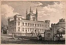 Over the next two and a half centuries, the school suffered from insufficient buildings and staff and the pupil roll never exceeded 29.[15][12] Many principals were appointed, but resigned or were dismissed by the States of Guernsey.[16] In 1824, due to increased demand for a higher standard of local education and a properly-run College,[17] the island's Lieutenant Governor, John Colborne, established a committee to review the school.[10] It was re-chartered that year,[17] and by 1826, with new staff and an improved curriculum, the school was ready to attract pupils from England. On 19 October 1826, the foundation stone of a new building was laid by Colborne,[18] and the school was renamed the Royal College of Elizabeth.[10][19]