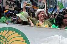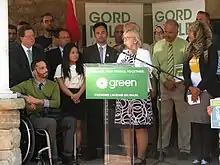 On August 26, 2006, May won the leadership election on the first ballot. She tallied 65.3% of the votes, beating her main rival, David Chernushenko (33.3%) and Jim Fannon (0.88%). She said one of the main platforms for the next election would be to renegotiate the North American Free Trade Agreement (NAFTA). At the time of her election as leader, May said she intended to run in the riding of Cape Breton—Canso in the next federal election, although she also said she would stand in a federal byelection if one occurred prior to the next general election.[22] In the fall of 2006, May ran for election in London North Centre, finishing second to Glen Pearson of the Liberal Party. While she lost, May's showing in this by-election was the best result, in terms of percentage, achieved by the Green Party of Canada at that time.[23][24]