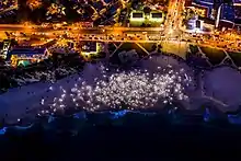 Shoreline Project premiered on November 3, 2018 in partnership with the Laguna Art Museum's annual Art & Nature Festival and the City of Laguna Beach. 1,000 participants moved with LED-lit umbrellas along the edge of the Pacific. Filmed by drones, the production revealed the undulations of a single organism, individuals coming together organically, as one form.[3]