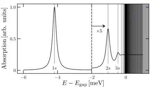 In general, the exciton eigen energies consist of a series of bound states that emerge energetically well below the fundamental bandgap energy and a continuum of unbound states that appear for energies above the bandgap. Therefore, a typical semiconductor's low-density absorption spectrum shows a series of exciton resonances and then a continuum-absorption tail. For realistic situations, increases more rapidly than the exciton-state spacing so that one typically resolves only few lowest exciton resonances in actual experiments.