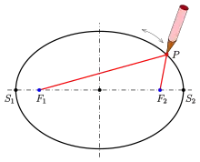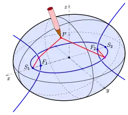 The construction of points of a 3-axial ellipsoid is more complicated. First ideas are due to the Scottish physicist J. C. Maxwell (1868).[8] Main investigations and the extension to quadrics was done by the German mathematician O. Staude in 1882, 1886 and 1898.[9][10][11] The description of the pins-and-string construction of ellipsoids and hyperboloids is contained in the book Geometry and the imagination written by D. Hilbert & S. Vossen,[12] too.