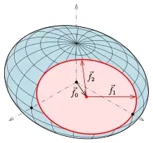 one finds, that the corresponding focal conics used for the pins-and-string construction have the same semi-axes as ellipsoid . Therefore (analogously to the foci of an ellipse) one considers the focal conics of a 3-axial ellipsoid as the (infinite many) foci and calls them the focal curves of the ellipsoid.[13]