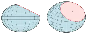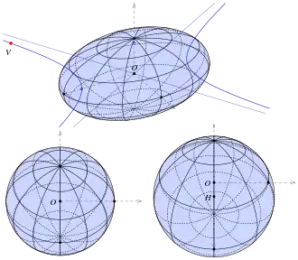 - If one views an ellipsoid from an external point of its focal hyperbola, than it seems to be a sphere, i.e. the apparent shape is a circle. Or equivalent: The tangents of the ellipsoid containing point are the lines of a circular cone, whose axis of rotation is the tangent of the hyperbola at .[14][15] If one allows the center to disappear into infinity, one gets an orthogonal parallel projection with the corresponding asymptote of the focal hyperbola as direction. The true curve of shape (tangent points) on the ellipsoid is i.g. no circle! The lower part of the diagram shows on the left a parallel projection of an ellipsoid (semi-axes: 60, 40, 30) along an asymptote and on the right a central projection with center and main point on the tangent of the hyperbola at point . ( is the foot of the perpendicular from onto the image plane.) For both projections the apparent shape is a circle. In the parallel case the image of the origin is the circle's center, in the central case main point is the center.