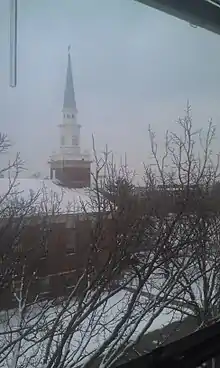 Chapel, from Stanger Hall - Hammerschmidt Memorial Chapel, dedicated in 1959 and named in honor of benefactor Louis Hammerschmidt and family,[62] serves as both a place of worship and for public lectures, musical events and other assemblies. The building served as a temporary library in 1993 when the A.C. Buehler library was being renovated, then underwent its own renovation and reopened 1994.[66] It houses the English and Philosophy departments as well as general classrooms. The chapel has two pipe organs, a Moller Opus on the stage in the main auditorium[67] and a smaller pipe organ in the Prayer Chapel. The main auditorium seats about 1,000.