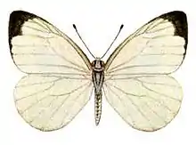 The wingspan is about 35 mm. The upperside of the wings is white with dark brown wingtips, while the underside is white with a yellow patch near the body.