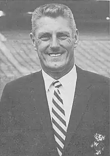 In March 1960, Hirsch signed a three-year contract to serve as the general manager of the Los Angeles Rams; he replaced Pete Rozelle as the Rams' general manager after Rozelle was hired as NFL commissioner.[72] The Rams began the 1960s in the lower tier of the NFL, compiling a losing record each year from 1959 to 1965.[73] As general manager, he was in charge of scouting, the college draft, and negotiating player and coach contracts.[20] During his tenure as general manager, the team drafted numerous talented players, including quarterback Roman Gabriel (first round pick in 1961), Deacon Jones (14th round pick in 1961), and Merlin Olsen (first round pick in 1962), player who helped the Rams improve to 11–1–2 in 1967 and 10–3–1 in 1968.[73] In 1963, after Dan Reeves acquired outright ownership of the Rams, Hirsch's title was changed to assistant to the president. He continued to serve as Reeves' assistant through the 1968 season.[7]
