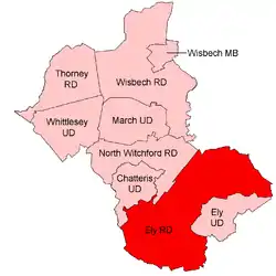 Ely was a rural district in England from 1894 to 1974.[1] It was named after Ely, and surrounded it to the west and north. The district was created in 1894 under the Local Government Act 1894 from the Ely rural sanitary district. It formed part of the administrative county of the Isle of Ely from 1894 to 1965, when this was merged into Cambridgeshire and Isle of Ely.