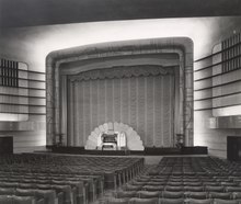 A 24-foot deep stage and orchestra pit, in the auditorium, could accommodate live performances as there were also four adjacent dressing rooms. The large screen was controlled by a mechanism, that could make it move backwards and forwards. When a picture was showing it was lowered towards the audience, thereby minimising eye-strain.[31] The latest system of Western Electric wide-range apparatus provided rich sound quality and substantially high production value; Sinden and Lyons wanted to ensure that hearing would be perfect from every seat in the house. Concealed lighting was fitted throughout the building, and controlled from the roof, to achieve special, flat skylight effects.