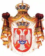 The coat of arms of the Kingdom of Yugoslavia (previously called Kingdom of Serbs, Croats and Slovenes) was an evolution of the coat of arms of Serbia. Graphically the coat of arms were similar, featuring only two major differences, the first difference being the royal crowns. The royal Serbian coat of arms depicts the Obrenović dynastic crown, while the royal Yugoslav coat of arms depicted the ruling Karađorđević dynastic crown.