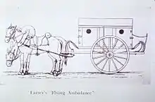 The first use of the ambulance as a specialized vehicle, in battle came about with the ambulances volantes designed by Dominique Jean Larrey (1766–1842), Napoleon Bonaparte's chief surgeon.[13][14] Larrey was present at the battle of Spires, between the French and Prussians, and was distressed by the fact that wounded soldiers were not picked up by the numerous ambulances (which Napoleon required to be stationed two and half miles back from the scene of battle) until after hostilities had ceased, and set about developing a new ambulance system.[13][14][15] Having decided against using the Norman system of horse litters, he settled on two- or four-wheeled horse-drawn wagons, which were used to transport fallen soldiers from the (active) battlefield after they had received early treatment in the field.[14] Larrey's projects for 'flying ambulances' were first approved by the Committee of Public Safety in 1794. Larrey subsequently entered Napoleon's service during the Italian campaigns in 1796, where his ambulances were used for the first time at Udine, Padua and Milan, and he adapted his ambulances to the conditions, even developing a litter which could be carried by a camel for a campaign in Egypt.[14]