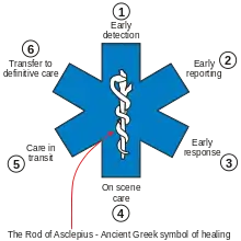 Emergency medical services exists to fulfill the basic principles of first aid, which are to Preserve Life, Prevent Further Injury, and Promote Recovery. This common theme in medicine is demonstrated by the "star of life". The Star of Life shown here, where each of the 'arms' to the star represent one of the six points, are used to represent the six stages of high quality pre-hospital care, which are:[35]