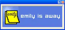 Emily Is Away is an indie visual novel by game developer Kyle Seeley, released for free in November 2015. Set in the early-to-mid 2000s, Emily Is Away tells the story of the protagonist's relationship with a girl, Emily, over the course of five years, from the senior year of high school to the senior year of college.[2] The game is presented through a chat client on Windows XP styled after ICQ and AOL Instant Messenger, specifically their builds in the early-to-mid 2000s, complete with other users' profiles and interface. The choices for profile pictures are generally collected from the culture of the early-to-mid 2000s, including 28 Days Later, The Ring, Harry Potter, Lord of the Rings, blink-182, Red Hot Chili Peppers, Eminem, and Avril Lavigne on the first level.