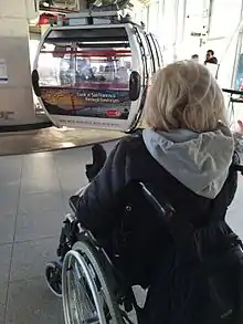 There are 36 passenger gondolas, of which 34 are in use at any one time, with a maximum capacity of 10 passengers each.[26] All passenger gondolas are ready for disabled persons using wheelchairs, including those ones with leg rest extensions. There are also two (open) engineers' gondolas for use by maintenance staff.