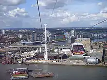 The eastern end of the cable car line (51.5077°N 0.0179°E) is at the Royal Docks, home to the ExCeL Centre, which hosted a number of martial arts, boxing, table tennis and weightlifting events during the 2012 London Olympics. The closest interchange to the Docklands Light Railway is at Royal Victoria station.