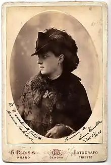 Turolla performed at London's Covent Garden in 1879, and again in 1880.[2] She was with the San Carlo Theatre in Lisbon for the 1881-1882 season.[3] She was a regular performer in Budapest, under contract at the Hungarian Royal Opera House from 1883 to 1886. She was popular in Prague in 1883,[4] and in Vienna in the 1883-1884 season.[5] In 1887, she toured South America.[6] She was especially known for singing the title role in Aida and Leonora in Il Trovatore, among other parts.[1] "La voce della Turolla è sonora e potente, senza stridi nè durezze, uniforme dai bassi agli acuti" (The voice of Turolla is sonorous and powerful, without harshness or hardness, uniform from bass to treble), commented one critic of the time.[7] She endorsed Soden Mineral Pastilles in newspaper advertisements in 1888.[8] In 1908, she began a singing school in Milan.[9]