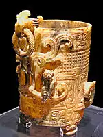 Right: a gilded bronze wine warmer with animalistic relief decorations, 26 BCE, Western Han period
