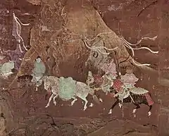 Meanwhile, the Tang relationship with Qapaghan Qaghan of the Göktürks had fluctuated during the first few years of the Kaiyuan era, as minor hostilities occurred at the borders as well as contests over vassals' loyalty for the two states, but they were also at times friendly to each other, with Qapaghan requesting at times to marry a Tang princess and Emperor Xuanzong agreeing to the proposal. In 716, however, Qapaghan was killed in battle against the Bayegu (拔野古), and from that point on, lacking his efficient leadership, the Göktürks, while remaining an important regional power, posed much less of a threat to China,[20] although at times still capable of dealing serious defeats to Tang forces, as was the case in 720 when the Göktürk general Tonyukuk defeated the Tang garrison at Liang Prefecture (涼州, roughly modern Wuwei, Gansu) and the Tang vassal Basmyl.[24] Meanwhile, Tang, the Tibetan Empire, and the Umayyad Caliphate were constantly engaging in a three-way tug of war for influence in the Xiyu (i.e., modern Xinjiang and former Soviet Central Asia) region. In 715, for example, when the king of Bahanna (拔汗那) was expelled by a new king supported by the Tibetan Empire and the Umayyad Caliphate, Tang forces commanded by the general Zhang Xiaosong (張孝嵩) attacked the new king and restored the old king.[20] General Tang Jiahui led the Chinese to defeat the following Arab-Tibetan attack in the Battle of Aksu (717).[25] The attack on Aksu was joined by Turgesh Khan Suluk.[26][27] Both Uch Turfan and Aksu were attacked by the Turgesh, Arab, and Tibetan force on 15 August 717. Qarluqs serving under Chinese command, under Arsila Xian, a Western Turkic Qaghan serving under the Chinese Assistant Grand Protector General Tang Jiahui defeated the attack. Al-Yashkuri, the Arab commander and his army fled to Tashkent after they were defeated.[28][29]