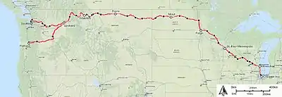 The current Amtrak Empire Builder passes through Oregon, Washington, Idaho, Montana, North Dakota, Minnesota, Wisconsin, and Illinois. It makes service stops in Spokane, Washington; Havre, Montana; Minot, North Dakota; and Saint Paul, Minnesota. Its other major stops include Vancouver, Washington; Whitefish, Montana; Williston, North Dakota; Fargo, North Dakota; and Milwaukee, Wisconsin. It uses BNSF Railway's Northern Transcon from Seattle to Minneapolis, Minnesota Commercial from Minneapolis to St. Paul, the Canadian Pacific (former Milwaukee Road) from St. Paul to Rondout, Illinois, and Metra's Milwaukee District / North Line (former Milwaukee Road) from Rondout to Chicago. The St. Paul to Chicago portion currently follows the route of the former Twin Cities Hiawatha. In pre-Amtrak days it used the Twin Zephyrs routing.