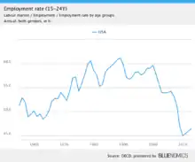 Employment is no guarantee of escaping poverty, the International Labour Organization (ILO) estimates that as many as 40% of workers are poor, not earning enough to keep their families above the $2 a day poverty line.[33] For instance, in India most of the chronically poor are wage earners in formal employment, because their jobs are insecure and low paid and offer no chance to accumulate wealth to avoid risks.[33] According to the UNRISD, increasing labor productivity appears to have a negative impact on job creation: in the 1960s, a 1% increase in output per worker was associated with a reduction in employment growth of 0.07%, by the first decade of this century the same productivity increase implies reduced employment growth by 0.54%.[33] Both increased employment opportunities and increased labor productivity (as long as it also translates into higher wages) are needed to tackle poverty. Increases in employment without increases in productivity leads to a rise in the number of "working poor", which is why some experts are now promoting the creation of "quality" and not "quantity" in labor market policies.[33] This approach does highlight how higher productivity has helped reduce poverty in East Asia, but the negative impact is beginning to show.[33] In Vietnam, for example, employment growth has slowed while productivity growth has continued.[33] Furthermore, productivity increases do not always lead to increased wages, as can be seen in the United States, where the gap between productivity and wages has been rising since the 1980s.[33]