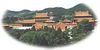 Empress Dowager Ci'an was interred amidst the Eastern Qing tombs, 125 km (78 mi) east of Beijing. She was denied burial next to her husband in the Ding Mausoleum.[36] Instead she was interred in the Eastern Ding Mausoleum (定東陵) tomb complex, along with Empress Dowager Cixi. More precisely, Empress Dowager Ci'an lies in the Puxiangyu Eastern Ding Mausoleum (普祥峪定東陵; 'tomb east of the Ding Mausoleum in the vale of wide good omen'), while Cixi built herself the much larger Putuoyu Eastern Ding Mausoleum (菩陀峪定東陵; 'tomb east of the Ding Mausoleum in the vale of Putuo'). The Ding Mausoleum (literally "tomb of quietude") is the tomb of the Xianfeng Emperor and is located west of the Dingdongling. The vale of Putuo owes its name to Mount Putuo, at the foot of which the Eastern Ding Mausoleum is located.