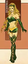 The Enchantress is a member of the race of superhumans known as Asgardians, and as such possesses superhuman strength, speed, stamina, and durability but prefers to avoid physical conflicts. She possesses an innate capacity to manipulate ambient magical energy, honed through practice for a variety of effects, including projecting magical power bolts, interdimensional teleportation of multiple Asgardians and non-Asgardians, protective energy shields, illusions, levitation, conjuring, transmutation (even of Asgardians), telekinesis, time-disruption, mind switching, and mind control. She has used her sorcery to enhance her natural beauty and allure, and to enchant her lips so that by kissing virtually any man she can make him her slave for about a week, unless she renews the treatment. She can also use her magic to heal any of her injuries rapidly, and possesses limited mystical senses. She can also absorb an opponent's life force to temporarily increase her own powers. A prolonged absence from Asgard tends to diminish her powers although they never fade completely. The Enchantress has been described as one of the most powerful sorceresses in Asgard, second only to Karnilla,[46] although their every direct confrontation has ended in a stalemate until interrupted.[47] However, Amora's sister Lorelei was later also enhanced beyond her own abilities.[48] The Enchantress has a gifted intellect, and possesses extensive knowledge of Asgardian mystic and amatory arts. On occasion, the Enchantress employs various mystical artifacts, potions, and power objects, such as the crystalline gem in which she entrapped Brunnhilde the Valkyrie's soul, and the potion she used to increase her hypnotic power over Thor in Avengers #7. It has been shown that Enchantress is unable to access her spells when her hands are bound and her mouth is gagged.[49]
