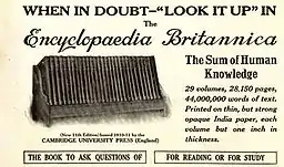 In March 2012, the company announced that the 2010 edition would be the last printed version. This was announced as a move by the company to adapt to the times and focus on its future using digital distribution.[17] The peak year for the printed encyclopaedia was 1990 when 120,000 sets were sold, but it dropped to 40,000 in 1996.[18] 12,000 sets of the 2010 edition were printed, of which 8,000 had been sold as of 2012.[19] By late April 2012, the remaining copies of the 2010 edition had sold out at Britannica's online store. As of 2016, a replica of Britannica's 1768 first edition is sold on the online store.[20]