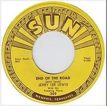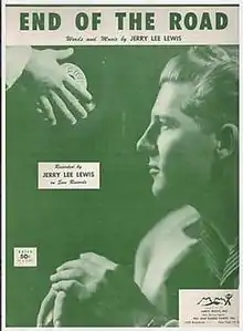 End of the Road is a song written and performed by musician Jerry Lee Lewis. Recorded in 1956, and released as a single in December of that year on Sun Records, the single was backed with Lewis' cover of the Ray Price song "Crazy Arms".[1][2] The recording was reissued in 1979 as a 7" 45 single as Sun 14 as part of the Sun Golden Treasure Series.[3] The song was also released in Canada in 1956 as a 45 single on Quality Records.
