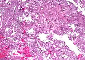 | Micrograph showing simple endometrial hyperplasia, where the gland-to-stroma ratio is preserved but the glands have an irregular shape and/or are dilated. Endometrial biopsy. H&E stain. | |