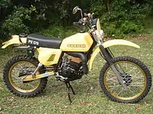 Enduro motorcycles closely resemble motocross, or "MX" bikes (upon which they are often based).[1] They may have special features such as oversized gas tanks, engines tuned for reliability and longevity, sump protectors, and more durable (and heavier) components. Enduro bikes combine the long-travel suspension of an off-road motocross bike with engines that are reliable and durable over long distances, and may be fitted with oversize gas tanks for adequate range. Some enduro bikes have street-legal features such as headlights and quiet mufflers to enable them to use public roadways. The engine of an enduro bike is usually a single cylinder 2-stroke between 125 cc and 360 cc, or 4-stroke between 195 and 650 cc.