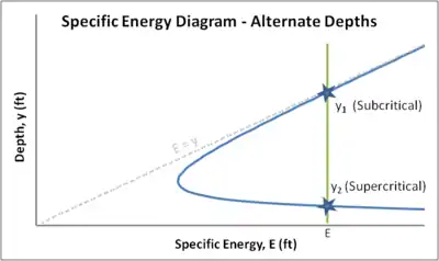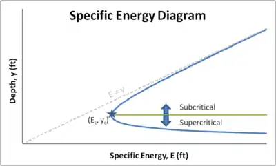Depth values on the E–y curve greater than the critical depth correspond to subcritical flow depths. Likewise, values less than the critical depth correspond to supercritical flow depths.