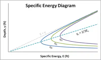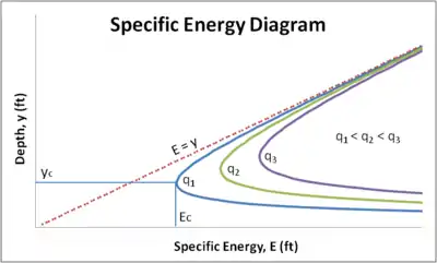 Three different q values are plotted on the specific energy diagram above. The unit discharges increase from left to right, meaning that q1 < q2 < q3. There is a distinct asymptotic relationship as the top part of the curve approaches the E = y line and the bottom part of the curve tends toward the x-axis. Also shown are the critical energy or minimum energy, Ec and the corresponding critical depth value, yc. The values shown are for the q1 discharge only, but unique critical values exist for any discharge.