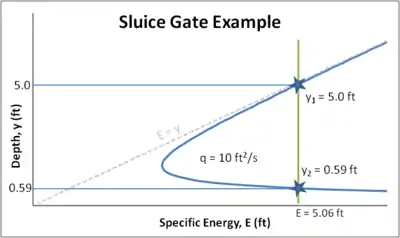 Since energy is conserved at a sluice gate, the upstream and downstream energies are equal, or . The specific energy equation (eq. 8), alternate depth equation (eq. 16), and an E–y diagram are used to demonstrate how to solve this problem.