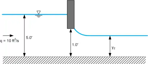 Water flows in a rectangular channel that contains a sluice gate. The upstream depth of flow, y1 is 5.0 ft, the sluice gate opening is 1.0 ft, and the unit discharge is, . What is the flow depth downstream of the sluice gate, y2?