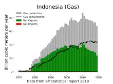 Energy in Indonesia describes energy and electricity production, consumption, import and export in Indonesia. In 2009 Indonesia produced oil, coal, natural gas and palm oil, utilised also as energy raw material in 2010. Renewable energy potential in Indonesia is high: solar, wind, hydro and geothermal energy. Tropical rain forests and peat land areas have extensive coal storage. Indonesia is a geologically unstable country. According to IEA Indonesia was the 10th top natural gas producer in 2009: 76 billion cubics (bcm) 2.5% of world production of which 36 bcm was exported. In 2009 Indonesia was the 5th top coal producer: 263 million tonnes hard coal and 38 million tonnes brown. The majority of this, 230 Mt of hard coal, was exported.[1] Indonesia has significant energy resources, starting with oil – it has 22 billion barrels of conventional oil and gas reserves, of which about 4 billion are recoverable. That's the equivalent of about 10 years of oil production and 50 years of gas. It has about 8 billion barrels of oil-equivalent of coal-based methane (CBM) resources. It has 28 billion tonnes of recoverable coal and has 28 gigawatts (GW) of geothermal potential.