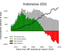 Oil is a major sector in the Indonesian economy. During the 1980s, Indonesia was a significant oil-exporting country. Since 2000, domestic consumption has continued to rise while production has been falling, so in recent years Indonesia has begun importing increasing amounts of oil. Within Indonesia, there are considerable amounts of oil in Sumatra, Borneo, Java, and West Papua Province. There are said to be around 60 basins across the country, only 22 of which have been explored and exploited.[7] Main oil fields in Indonesia include the following: