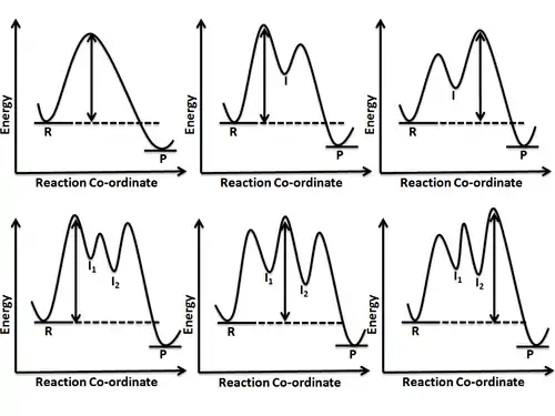 Reaction coordinate diagrams also give information about the equilibrium between a reactant or a product and an intermediate. If the barrier energy for going from intermediate to product is much higher than the one for reactant to intermediate transition, it can be safely concluded that a complete equilibrium is established between the reactant and intermediate. However, if the two energy barriers for reactant-to-intermediate and intermediate-to-product transformation are nearly equal, then no complete equilibrium is established and steady state approximation is invoked to derive the kinetic rate expressions for such a reaction.[7]