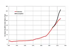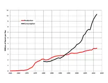 China accounts for 40% of the 2004 oil-consumption increase, and thus is a key part of the cycle which had led to the oil price increase worldwide.[7] China's import dependence remains at 60% as of 2014.[8] In 2005, a campaign to increase energy efficiency was launched without official Ministry of Energy approval; since the campaign was sporadic, this objective seems hard to meet. Zha Daojiong encouraged increased management of oil and energy in China, noting that "It is fair to say that the threat from ineffective energy industry governance is probably as great as that from the international energy market.".[7] A projection that China would reach South Korean levels of per-capita oil consumption in 30 years, combined with the current average global decline in production, could mean that up to 44 Mbbl/d (7,000,000 m3/d) (barrels per day) in production would have to be found in the next decade to keep up with increased demand and production declines. That would be the equivalent of roughly five times Saudi Arabia's production. Superimpose a production plateau of 100 Mbbl/d (16,000,000 m3/d), and significant real-price increases would be necessary to balance supply and demand. Such increases might have severe effects on the growth of emerging market economies such as China's.