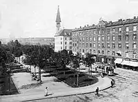 Enghave Plads was established when the Vesterbro area was built over in the late 1880s.[1] A playground was established on the site in the late 1880s at the initiative of architect and city council member Ferdinand Meldahl.[2] Enghave Plads School opened on the square in 1892. Christ Church, completed in 1900, was the second church to be built in the rapidly growing Vesterbro neighbourhood.[3] Boy with fiasco, a fountain designed by Jens Lund, was installed in the centre of the square in 1903.[4] For many years the square played host to an annual fun fair.[5]