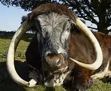 English Longhorn cattle (also formerly known as Lancashire cattle[1]) are a long-horned brown and white breed of beef cattle originating from Craven, in the north of England. The breed was initially used as a draught animal, which its body is well suited for; the milk was also collected for butter and cheese because of its high butterfat content. An individual farmer would have owned one or two cows; these would have been accompanied by a bull owned by the Lord of the Manor.[2] The notable long, curved horns that serve to distinguish this breed from others can make an individual appear aggressive, although by temperament they are usually friendly. Longhorns live surprisingly longer than other breeds of cattle and are also known for calving with ease. They have a white patch along the line of their spine and under their bellies.