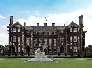 The great houses are the largest of the country houses; in truth palaces, built by the country's most powerful – these were designed to display their owners' power or ambitions to power.[10] Really large unfortified or barely fortified houses began to take over from the traditional castles of the crown and magnates during the Tudor period, with vast houses such as Hampton Court Palace and Burghley House, and continued until the 18th century with houses such as Castle Howard, Kedleston Hall and Holkham Hall.[11] Such building reached its zenith from the late 17th century until the mid-18th century; these houses were often completely built or rebuilt in their entirety by one eminent architect in the most fashionable architectural style of the day and often have a suite of Baroque state apartments, typically in enfilade, reserved for the most eminent guests, the entertainment of whom was of paramount importance in establishing and maintaining the power of the owner. The common denominator of this category of English country houses is that they were designed to be lived in with a certain degree of ceremony and pomp. It was not unusual for the family to have a small suite of rooms for withdrawing in privacy away from the multitude that lived in the household. These houses were always an alternative residence to a London house.