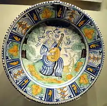 Blue-dash chargers, usually between about 25 and 35 cm in diameter with abstract, floral, religious, patriotic or topographical motifs, were produced in quantity by London and Bristol potters until the early 18th century. As they were kept for decoration on walls, dressers and side-tables, many have survived and they are well represented in museum collections. Their name comes from the slanting blue dashes round the rim, seen in both examples at the left.[5]