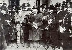 Petrosino received anonymous letters from Neapolitans in New York that confirmed Alfano's presence in the city, where he allegedly had given a banquet to several local Camorra members in a Grand Street restaurant.[6] On 17 April 1907, Petrosino and his agents raided the apartment at 108 Mulberry Street where Alfano was living and arrested him. The arrest caused a sensation in Naples.[31] He had been convicted of a crime involving moral turpitude in Italy and was turned over to the Federal authorities. Within three days he was expelled and put on a ship to Le Havre in France, where he was picked up by the Italian police.[4][6] He was put behind bars in Naples.[32] According to some sources, Alfano was linked to the lieutenant Petrosino's murder in Palermo on 12 March 1909,[6] however, had since been attributed to the Sicilian Mafia, and to Vito Cascio Ferro in particular.