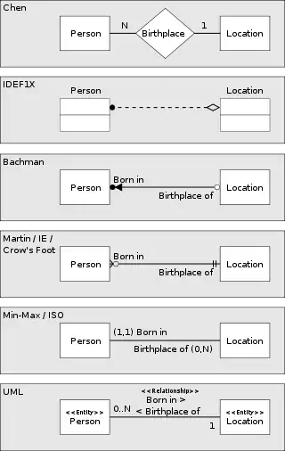 Various methods of representing the same one to many relationship. In each case, the diagram shows the relationship between a person and a place of birth: each person must have been born at one, and only one, location, but each location may have had zero or more people born at it.
