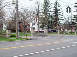 Entranceway at Main Street at High Park Boulevard is a suburban residential subdivision entranceway built about 1916 by developer Charles S. Burkhardt. It is located on Main Street (New York State Route 5) at Eggertsville in the town of Amherst within Erie County. It consists of tall and short stone posts, corresponding quarter-height stone walls, and accent light fixtures set on either side of the streets' intersecting corners.[2]
