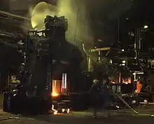 The shafts ran down by many slopes and spiral stairs to caverns far under; there Saruman had treasuries, store-houses, armouries, smithies, and great furnaces. Iron wheels revolved there endlessly, and hammers thudded. At night plumes of vapour steamed from the vents, lit from beneath with red light, or blue, or venomous green.[T 5]