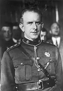 He served as a general in the National Army and was given control of the South-Western Command.[2] In the ensuing Irish Civil War he was one of the architects behind the Free State's strategy of seaborne landings in Republican-held areas. He took Limerick for the Free State in July 1922, before being held up in the Battle of Killmallock south of the city. The enmities of the civil war era were to stay with O'Duffy throughout his political career.